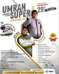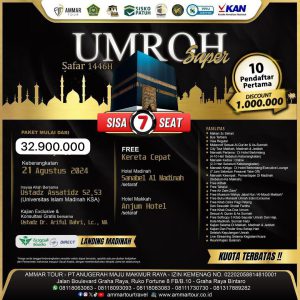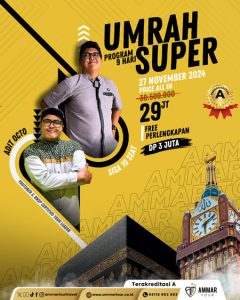 Yuk, ikuti Perjalanan Ibadah UMRAH bersama AmmarTour, “Perjalanan Senang Ibadah Tenang”. 100% pasti berangkat karena kami sudah mempunyai legalitas PT Anugerah Maju Makmur Jaya dan juga sudah berizin resmi dengan izin dari Kementrian Agama Republik Indonesia dengan No: 02202058814810001 Jadi tunggu apa lagi?! Daftar sekarang juga sebelum seat kehabisan.
