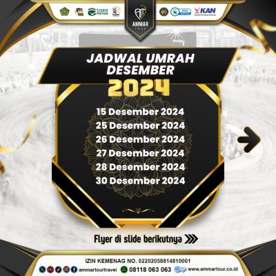 Yuk, ikuti Perjalanan UMRAH Ammar Tour, “Perjalanan Senang Ibadah Tenang” Keberangkatan Paket umroh bulan desember 2024 bersama PT Anugerah Maju Makmur Jaya (Ammar Tour & Travel) dengan izin Kemenang No: 02202058814810001