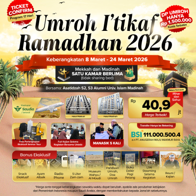 Bismillah, Segera daftarkan untuk melaksanakan Umroh Itikaf Ramadhan 2026 bersama Ammar Tour. Kami membuka pendaftaran Umroh Itikaf Ramadhan 2026 untuk keberangkatan 8 Maret 2026, ayo segera rencanakan ibadah Umroh Itikaf Ramadhan 2026 kamu bersama Ammar Tour, hubungi kami sekarang juga,, Yuk, ikuti Perjalanan Umroh bulan ramadhan bersama Ammar Tour, “Perjalanan Senang Ibadah Tenang” Keberangkatan pendaftaran Paket Ibadah Umroh Itikaf Ramadhan 2026 bersama PT Anugerah Maju Makmur Jaya (Ammar Tour & Travel) dengan izin Kemenang No: 0220205881481000 Untuk Info lebih lanjut Ammar Tour : Hubungi Kami: 08118 063 063 (Whatsapp Ikhwan) 0813 1788 9282 (Whatsapp Akhwat) 08111 730 730 (Whatsapp ke agenan) Kantor AmmarTour: Boulevard Graha Raya, Jl. Akses Graha Raya Ruko Fortune 8 FB/B.10 Graha Raya Bintaro - Tangerang Selatan 15324 . . biaya umroh 2024, travel haji, ramadhan 2025, paket haji dan umroh, travel umroh sesuai sunnah, biaya haji plus, umroh syawal 2024, tempat yang dikunjungi saat umroh, umroh 2024