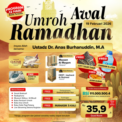 Sebentar lagi kita akan menyambut bulan suci ramadhan, apakah kamu sudah mendaftarkan paket umroh di awal bulan ramadhan?? Yuk segera daftarkan diri kamu dan keluarga untuk melaksanakan ibadah umroh di awal bulan ramadhan karena pahala umroh di bulan ramadhan sama dengan Haji. - Insya Allah Bersama: Ustadz Dr. Anas Burhanuddin, M.A - Tour Leader: Marwan, S.Kom* - Kajian Exclusive Yuk, ikuti Perjalanan UMRAH Ammar Tour, “Perjalanan Senang Ibadah Tenang” bersama PT Anugerah Maju Makmur Jaya (Ammar Tour & Travel) dengan izin Kemenang No: 0220205881481000 dan sudah TerAkreditasi A Daftar sekarang juga, seat sangat terbatas. Dapatkan diskon senilai idr. 1 juta/pax Untuk Info lebih lanjut Ammar Tour : Hubungi Kami: 08118 063 063 (Whatsapp Ikhwan) 0813 1788 9282 (Whatsapp Akhwat) 08111 730 730 (Whatsapp ke agenan) . Paket Umroh AmmarTour: Umroh plus Turkey, Umroh plus Dubai, Umroh Itikaf Ramadhan, Umroh Awal Ramadhan, Umroh Ramadhan, Umroh Syawal, Badal, Halal Tour, Umroh Awal Tahun, Umroh Akhir Tahun, Haji Furoda, Haji, Umroh