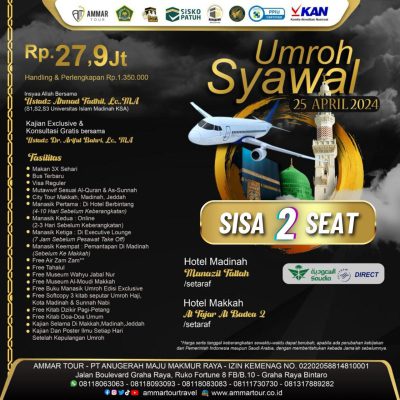 Umroh Syawal 2024 dengan keberangkatan 25 April 2024. Daftarkan Ibadah Umroh kamu bersama ammartour, Hubungi kami Sekarang juga untuk mendapatkan informasi terbaru.